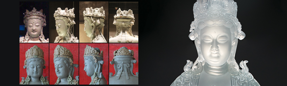2011年,首都博物館委託tittot 琉園, 開發製作此尊觀音像的琉璃藝術品。 而首要的難題就在於對帽冠的修復。 歷時了1000多個日夜, 30多次反復修改、顏色調製和燒製失敗… 修復完整的觀音造像終於塑形完成。 2014年5月,作品終於圓滿出爐, tittot琉園與首都博物館共同命名【水月微笑】, 傳心安神閒之喜,永葆藝術臻品之美。 繁體版介紹網頁 简体版介紹网页