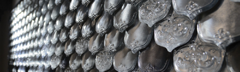 tittot琉園於去年發表琉璃空間裝置「Glaxie」,包括琉璃屏風、吊燈、牆飾等;以東方文化為元素,運用成熟的琉璃製作技術,結合異材質與空間結構設計,讓琉璃從擺飾品躍升為傢裝空間中的亮點,成為居家裝潢的新選擇。其中獲得本屆金玻獎工頁設計類首獎的作品「滴水」,就是由黃靜綺設計師所設計。「滴水」原是中式建築屋簷上略呈三角形的瓦頭,瓦尖向下,以利流水;在黃靜綺的巧思下,「琉璃滴水」如同樂高般智慧組裝成灰階琉璃瓦牆,創造出極度科技冷調啞光奢華。不論居家空間或商業空間,一片片不同花紋、顏色,並可自由組裝的滴水牆深受新一代室內設計師喜愛。