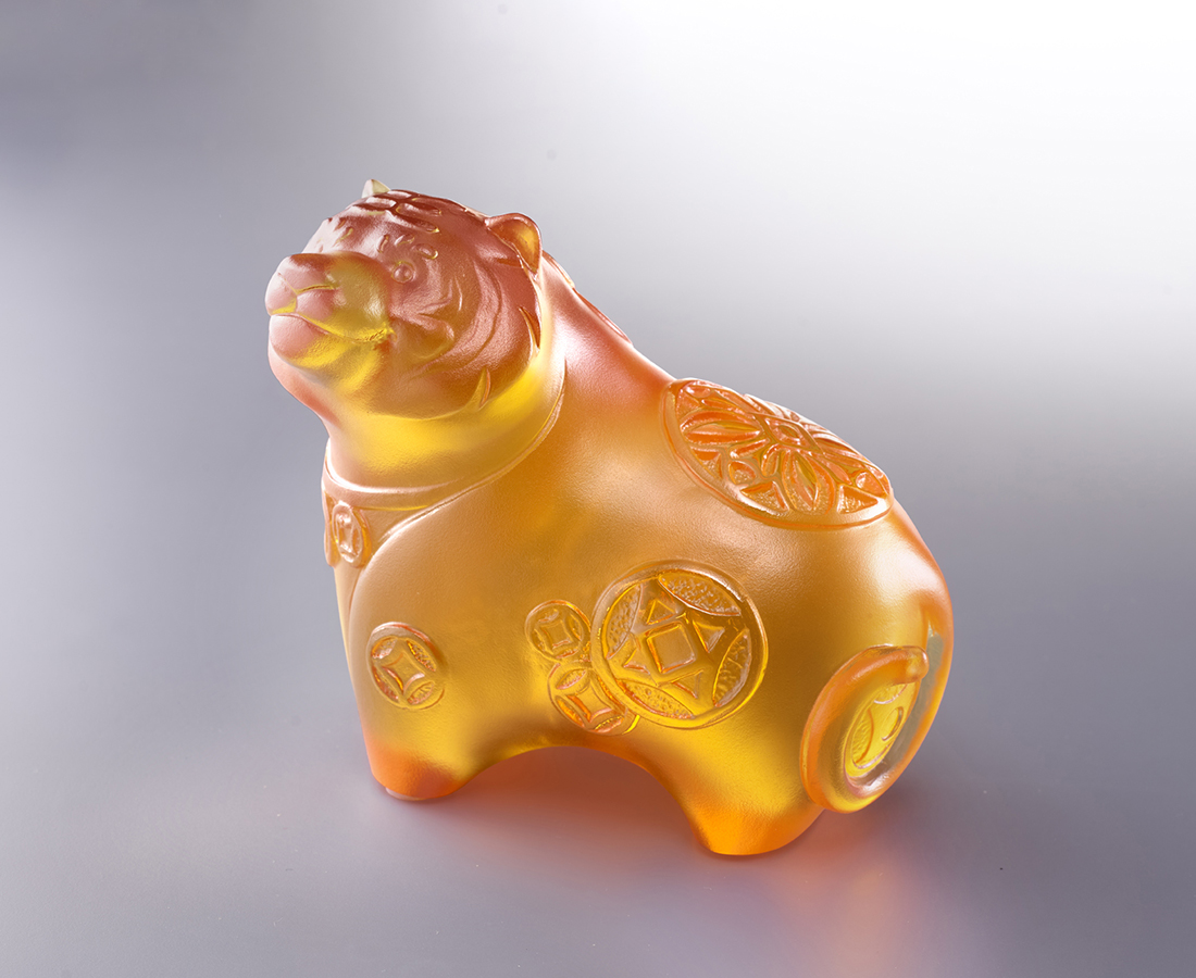 Tiger, one of the Chinese mythical beasts, symbolizes auspiciousness. Instead of the usually daring image, the work depicts the cute aspect of the tiger. The pattern of copper coins carved on the tiger conveys fortune and adds spirit to the image.- NO.1103959