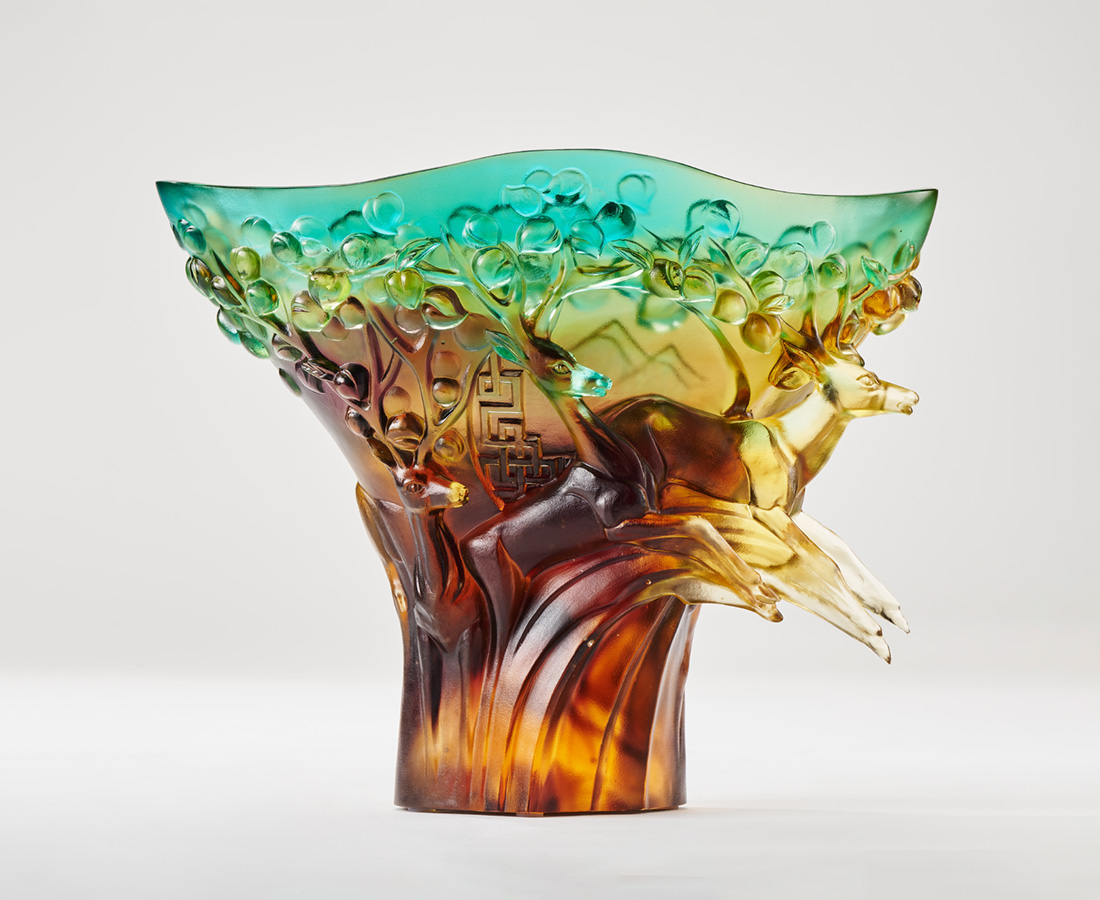 In Chinese, the pronunciation of deer is the same as "祿 (Lu)," while its graceful and upright image is very popular among people. In this bowl-shaped piece, the six deers can be seen in a circle, gradually rising and leaping in a continuous movement. In addition, the angles are transformed into a large fruit-bearing tree, symbolizing the bountiful harvest that will come from hard work and breakthroughs.- NO.1404086