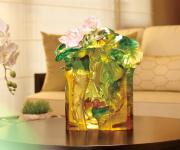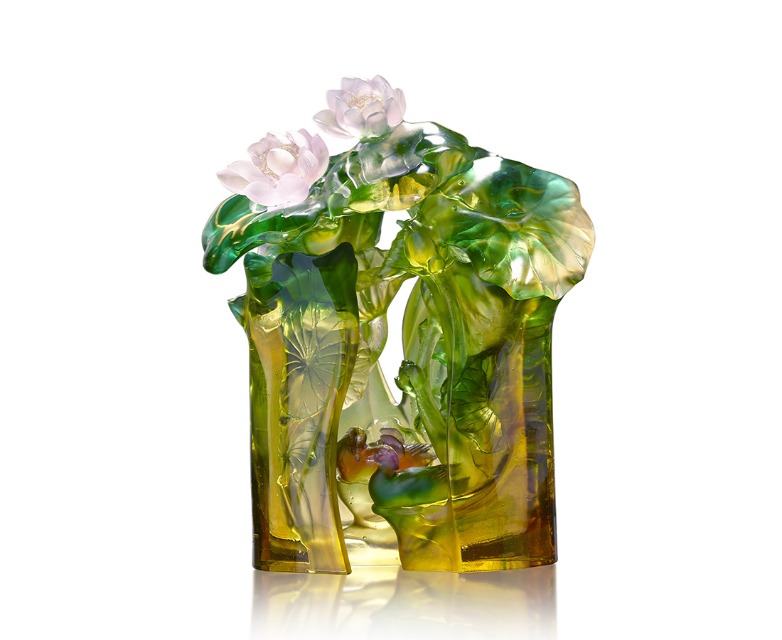 The artwork imitates Chinese brush painting by crystal glass, presenting the scenery of lotus pond with mandarin duck. Multilayered, the design creates a peculiar shade of color and infinite depth of field. With the translucent characteristic and different thickness of crystal glass, the artwork illustrates the goodwill between the lotus and mandarin duck.- NO.1513898