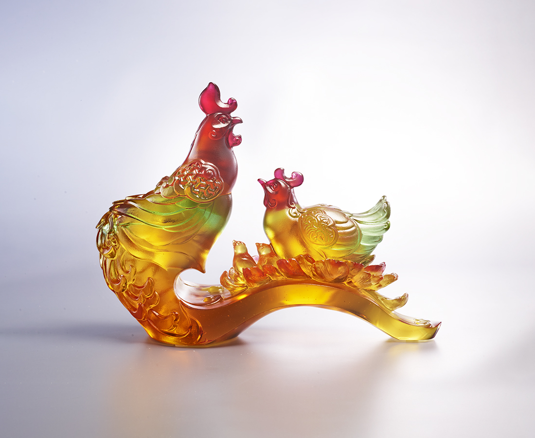In Chinese culture, the chicken is perceived as a symbol of fortune due to its similar pronunciation with the word. It also symbolizes protection and reassurance, since chickens cluck in the morning, alarming the people of daytime’s arrival. The work therefore presents a family of chickens, conveying the blessings of great chemistry and protection within a family. The red color of the chicken’s head, which required more effort during production, is the special feature of this work.- NO.1513984