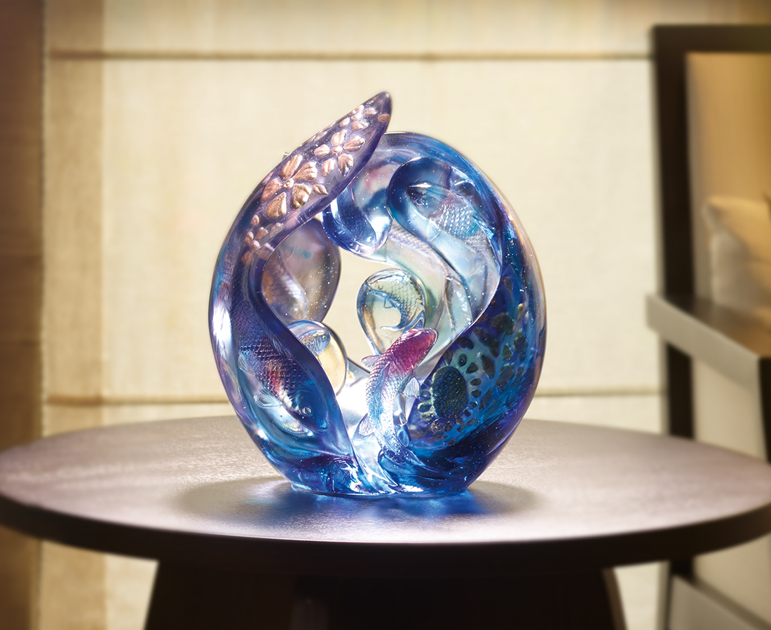 The artwork imitates brush painting by crystal glass, presenting the amusing scenery of koi carp leisuring under the lotus leaves. Due to the translucent characteristic and different thickness of crystal glass, the designer creates a peculiar shade of color and infinite depth of field. The curly petals and spiritual koi carp integrates into a sense of harmony and happiness.- NO.1543896