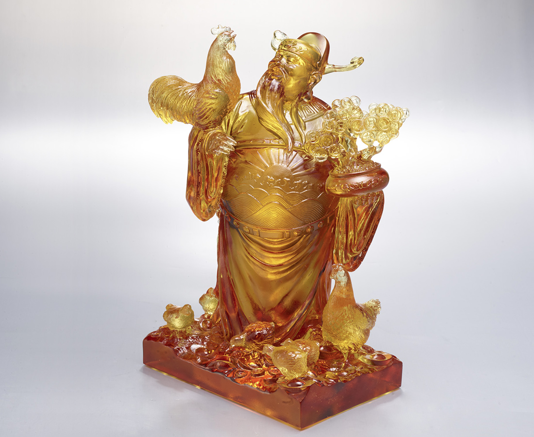 The cock standing on the God of Fortune crows aloud, seemingly reminding everybody to welcome the arrivals of good fortune.