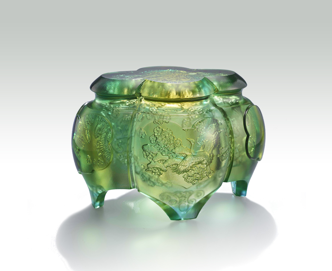 The artwork utilizes four petals as the design of vessel. The interior engraved with illustrations of pine, crane, and plum flower conveys infinite vitality. The outer polishing shows faintly the beauty of inner illustrations.- NO.1593920